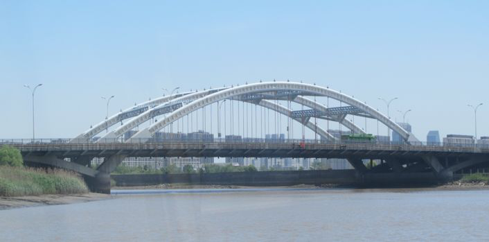 寧波鄞州大橋位于鄞州大道上,橫跨奉化江,全長510米,兩邊引橋各長175米。設(shè)計為雙向六車道,總寬68米,中間3跨,主橋構(gòu)造系中承式鋼筋混凝土系桿拱橋。