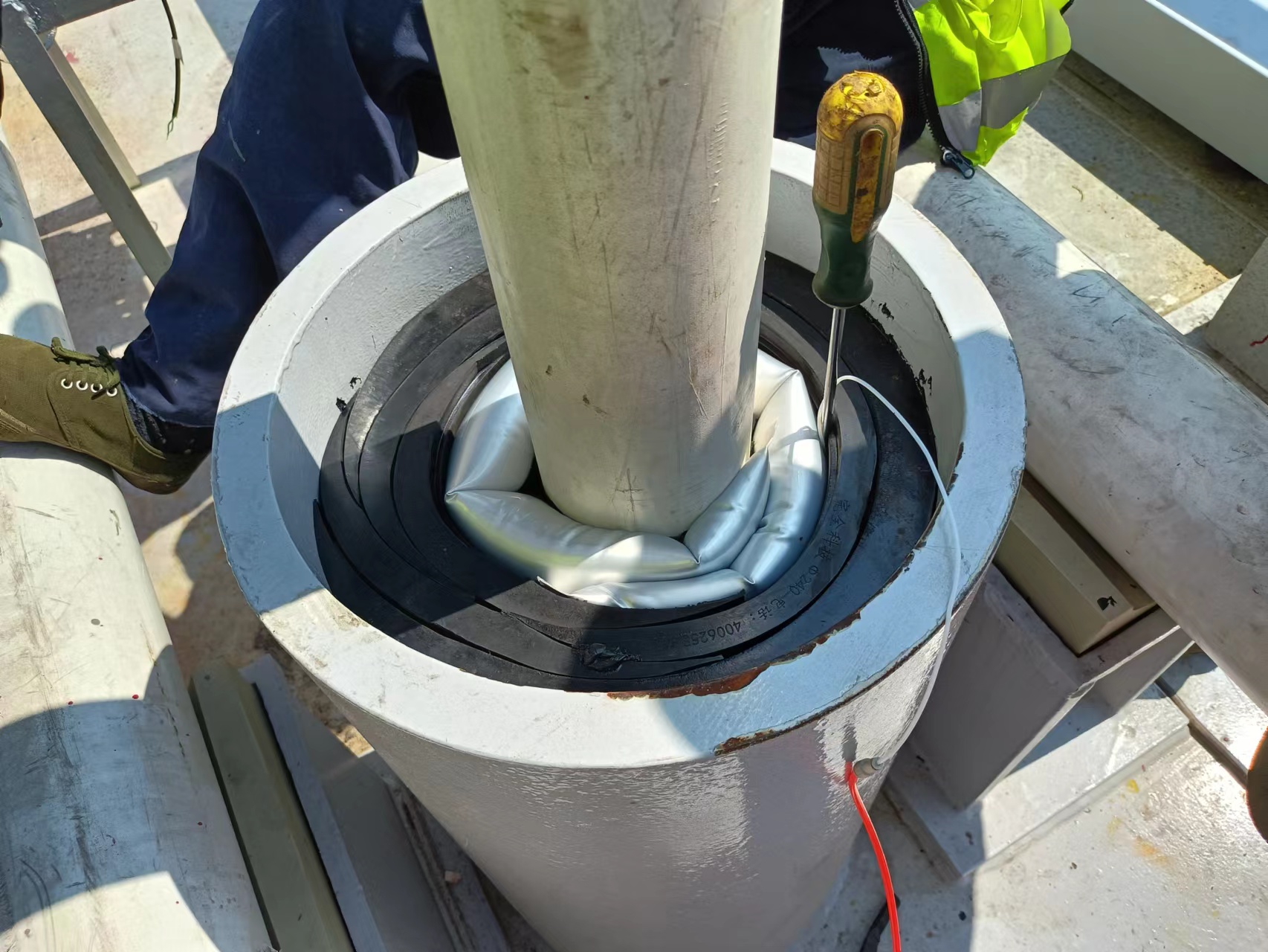 中交三航局清水塘大橋項目部針對清水塘大橋上層吊索導管孔防水密封,采用了株洲市完全科技有限公司生產的充氣型斜拉索導管防水密封系統(也稱為密封裝置)。該系統產品在現場施工過程中體現出的操作簡便、安裝快速、密封美觀的特點受到建設單位領導和施工安裝人員的好評。
