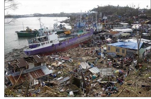新華社發 11月10日,在菲律賓萊特島,“海燕”過后,一艘輪船被沖上岸。